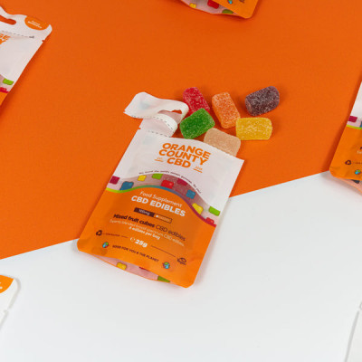 Cubetti gommosi al CBD formato da viaggio, confezione discreta.
