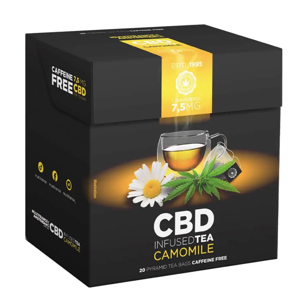 Questo tè è privo di THC e quindi legale in tutta l’Unione Europea. Viene prodotto con alta qualità nell’UE e confezionato in 20 bustine piramidali per un’infusione ottimale. È ideale come bevanda serale per favorire il rilassamento, ridurre lo stress e migliorare la qualità del sonno, grazie alla combinazione di camomilla e CBD.